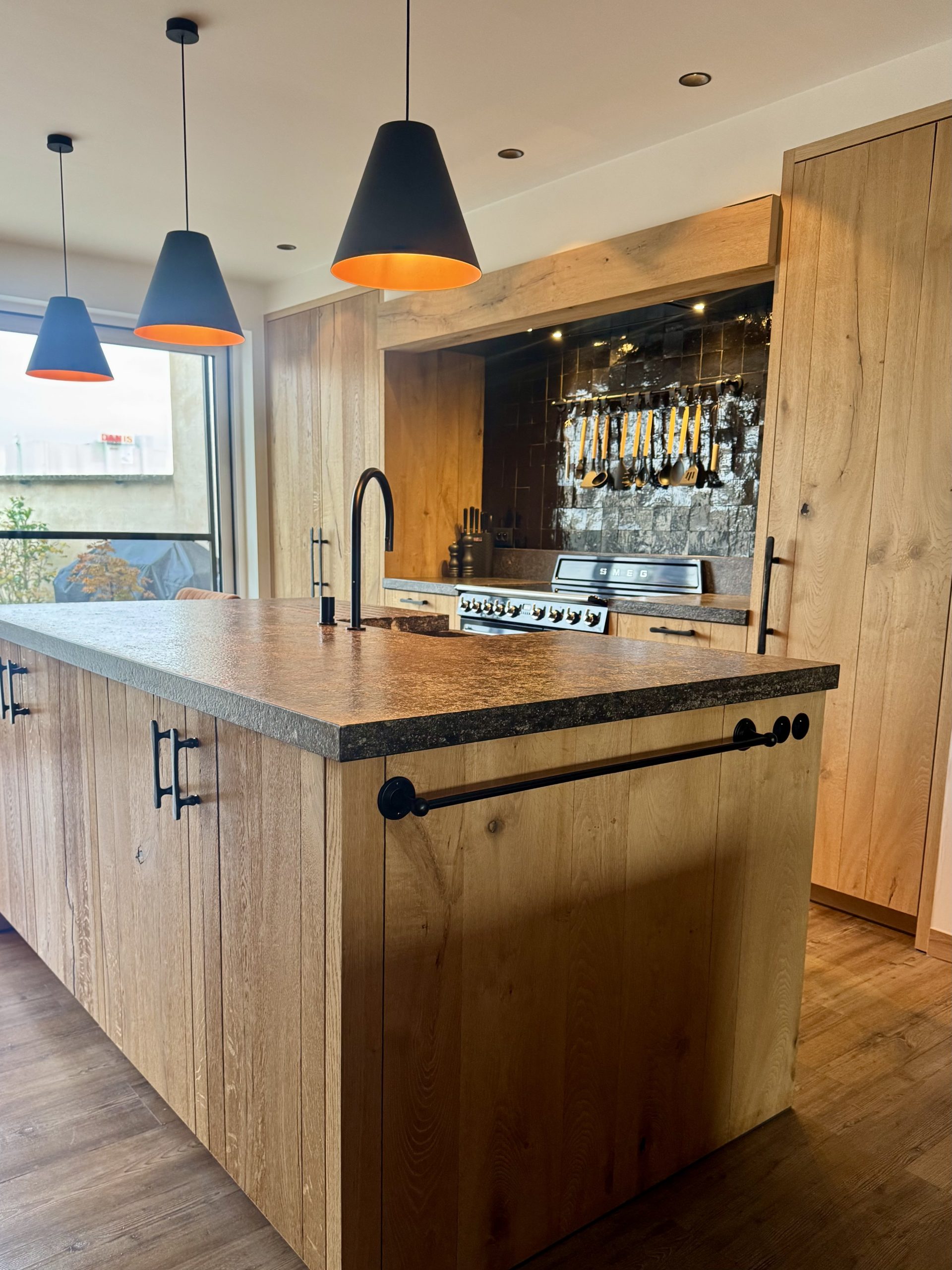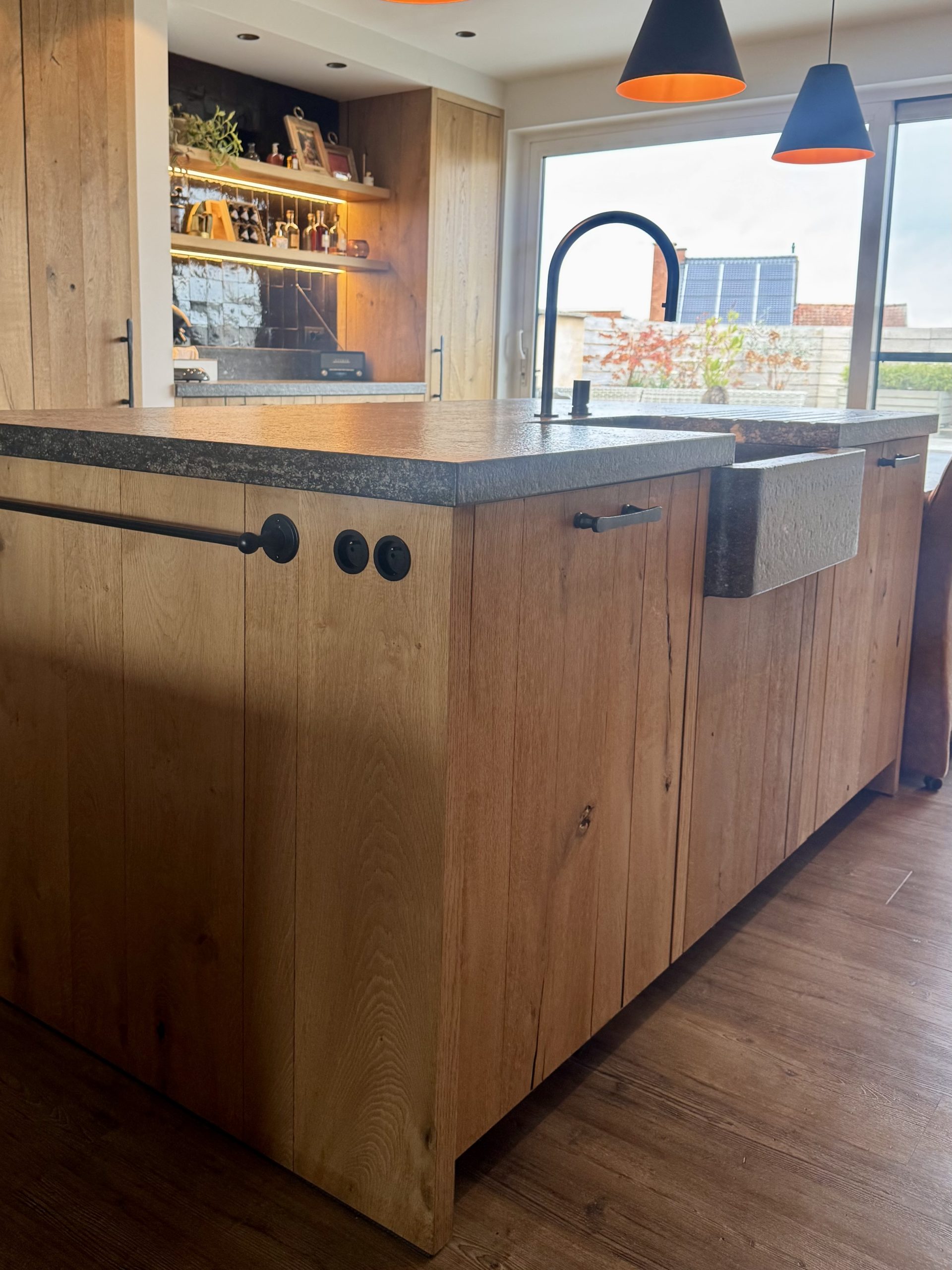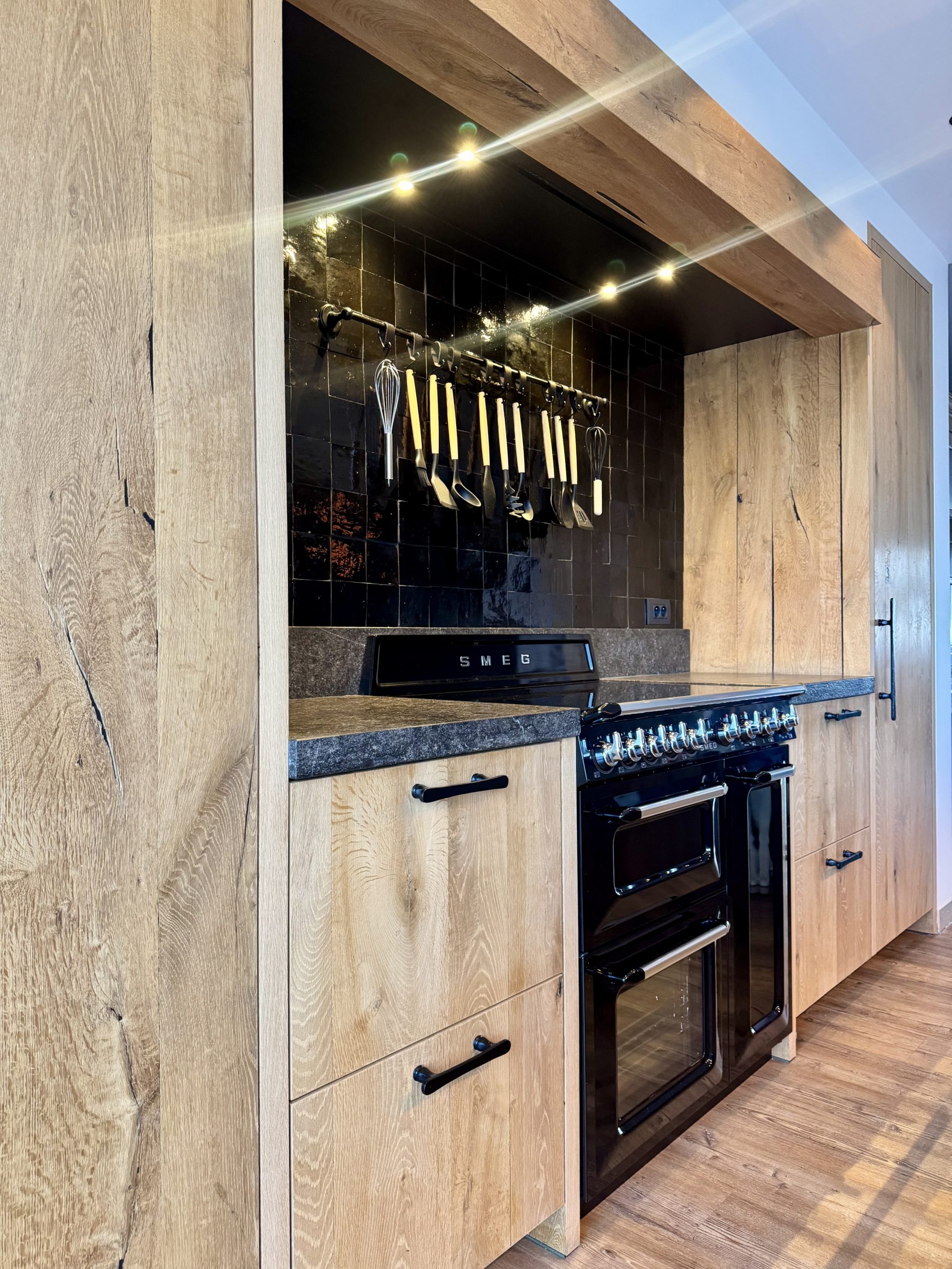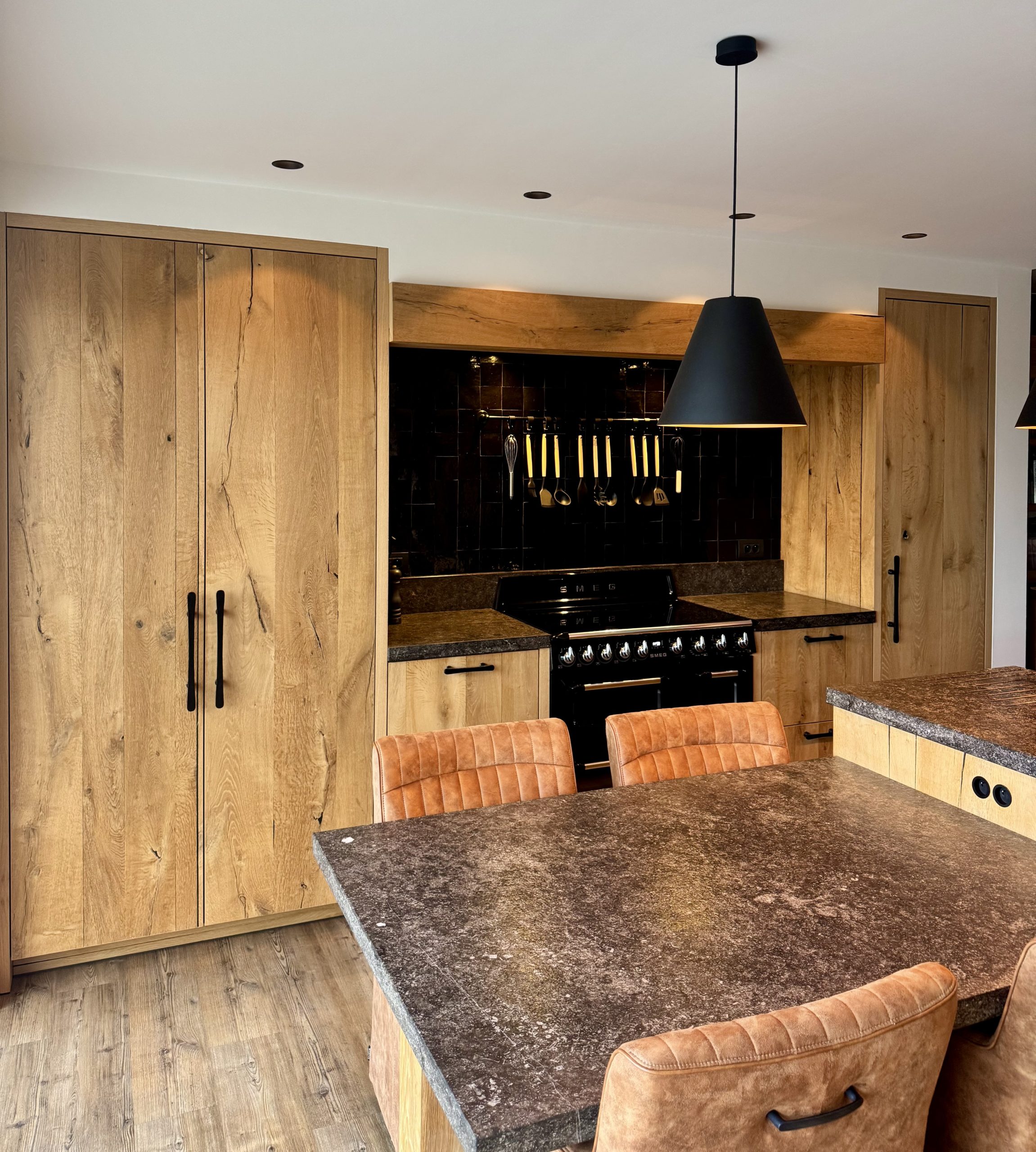 Prachtige landelijke keuken uitgevoerd in eiken natuurfineer. De zachte houttint en het pure lijnenspel brengen warmte en rust in het interieur. Tijdloos design en ambachtelijke afwerking komen hier samen in een harmonieus geheel dat zowel klassevol als uitnodigend aanvoelt.