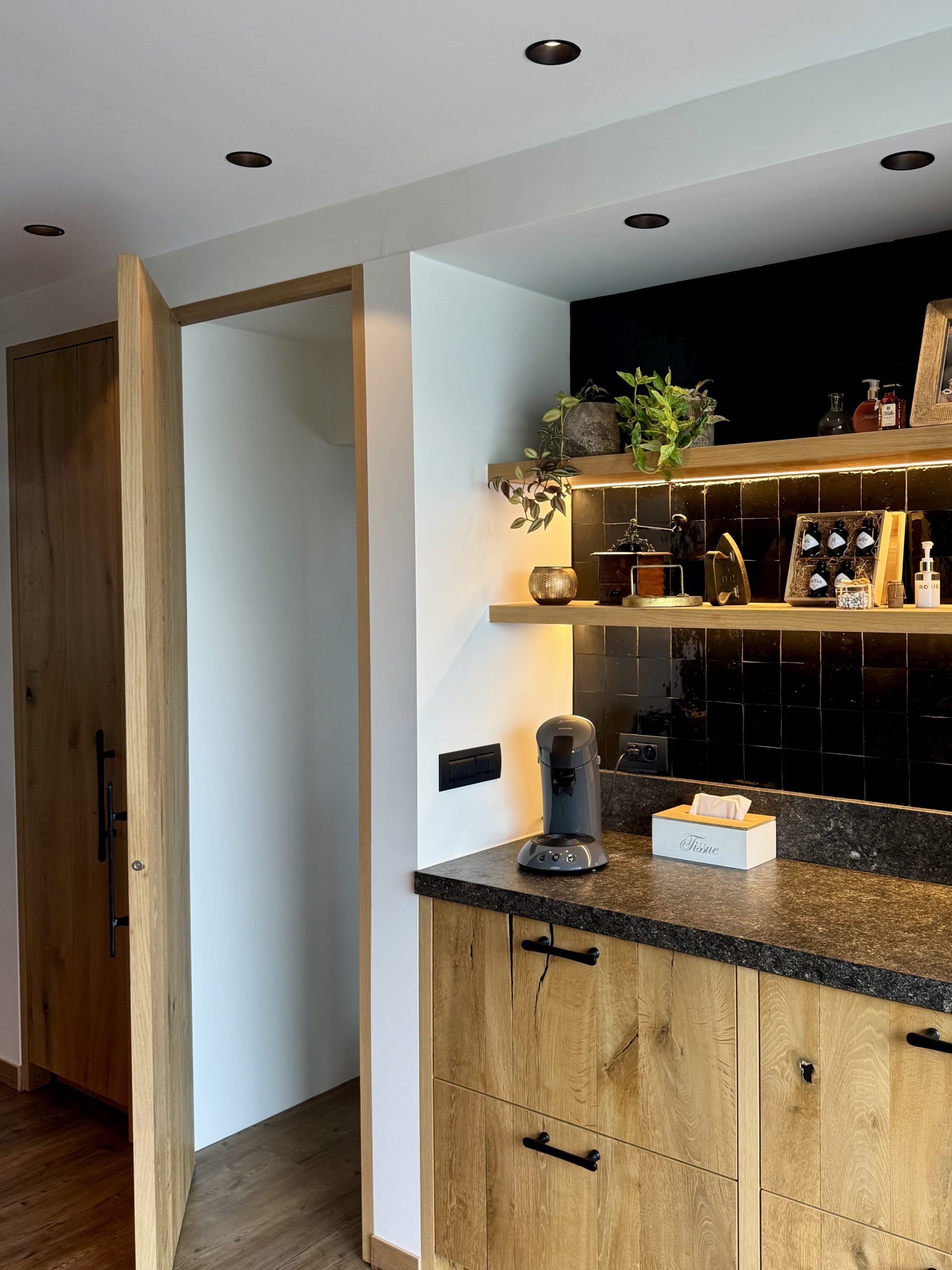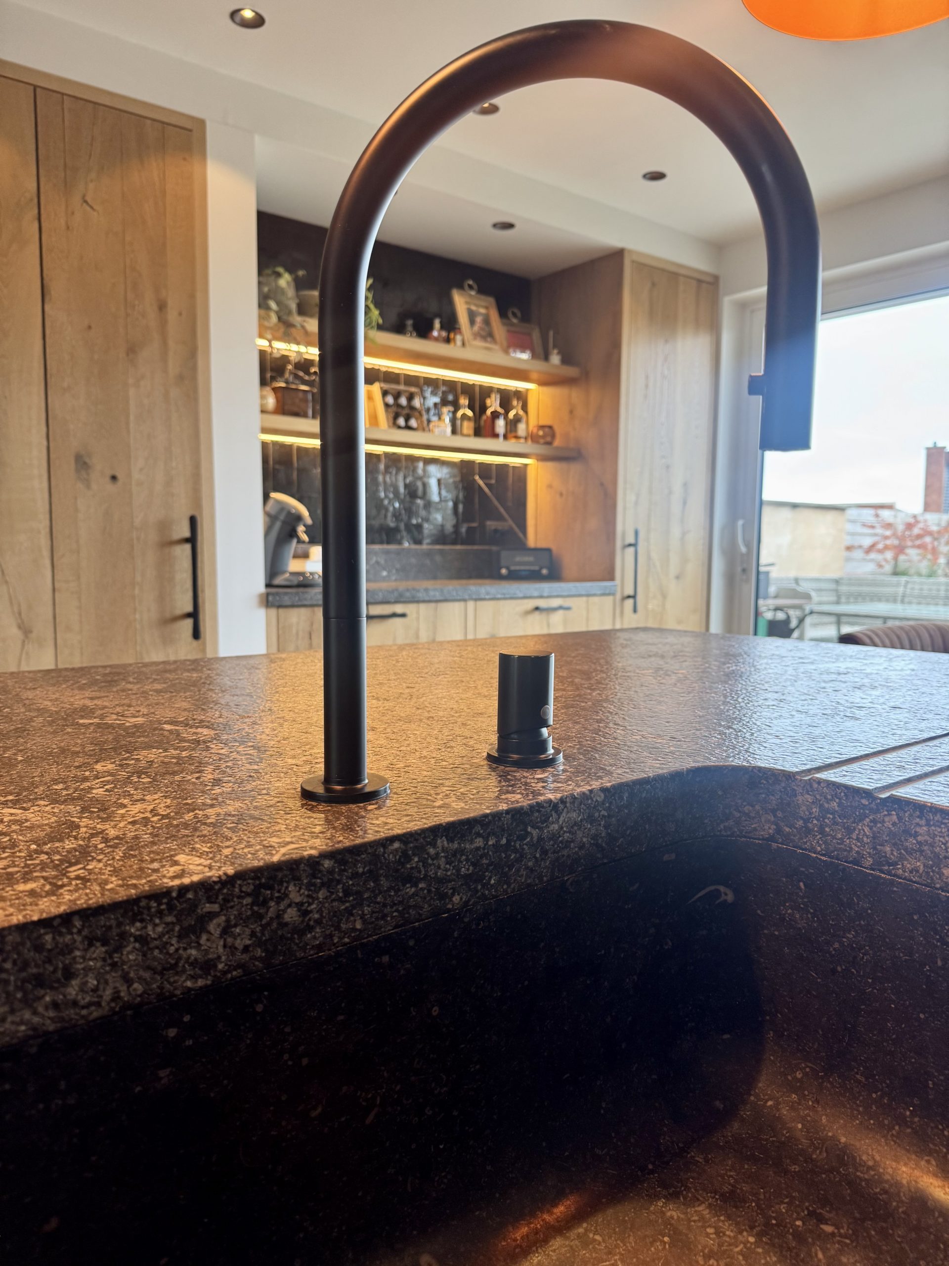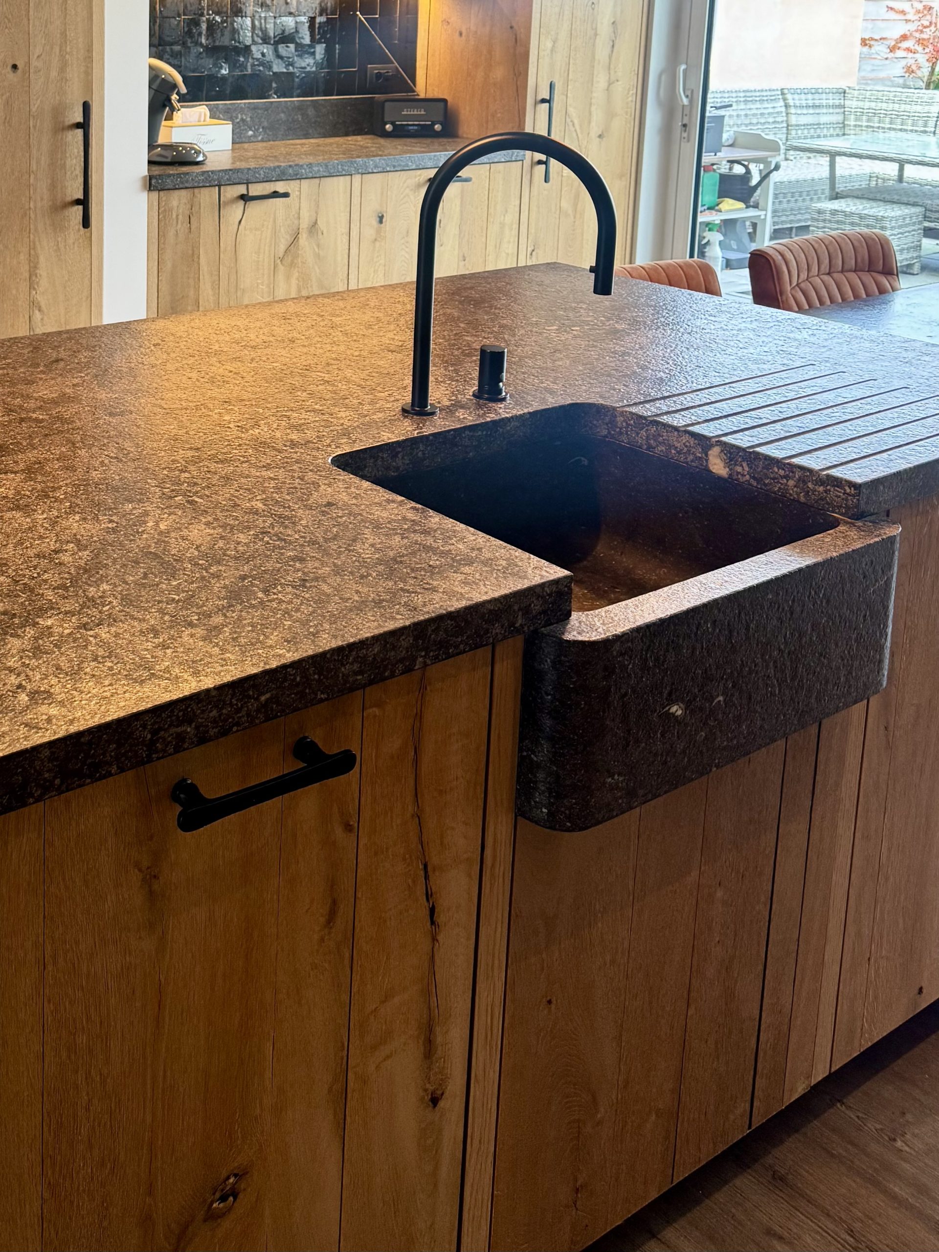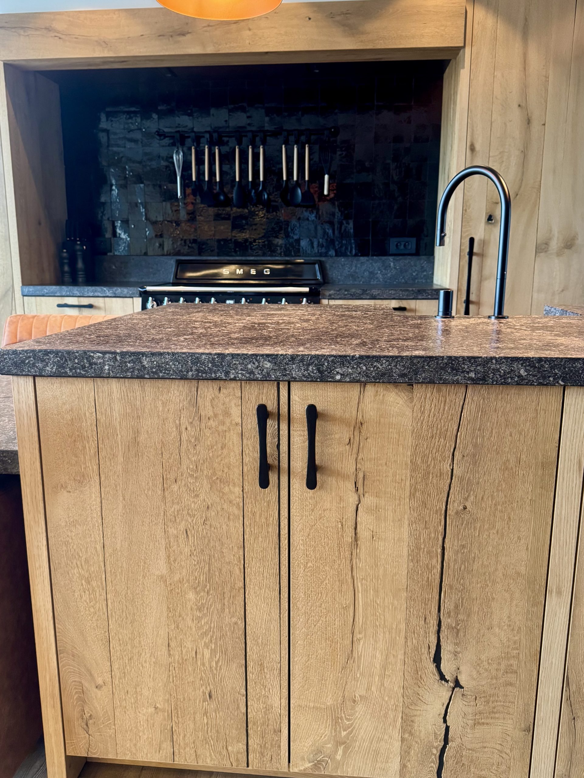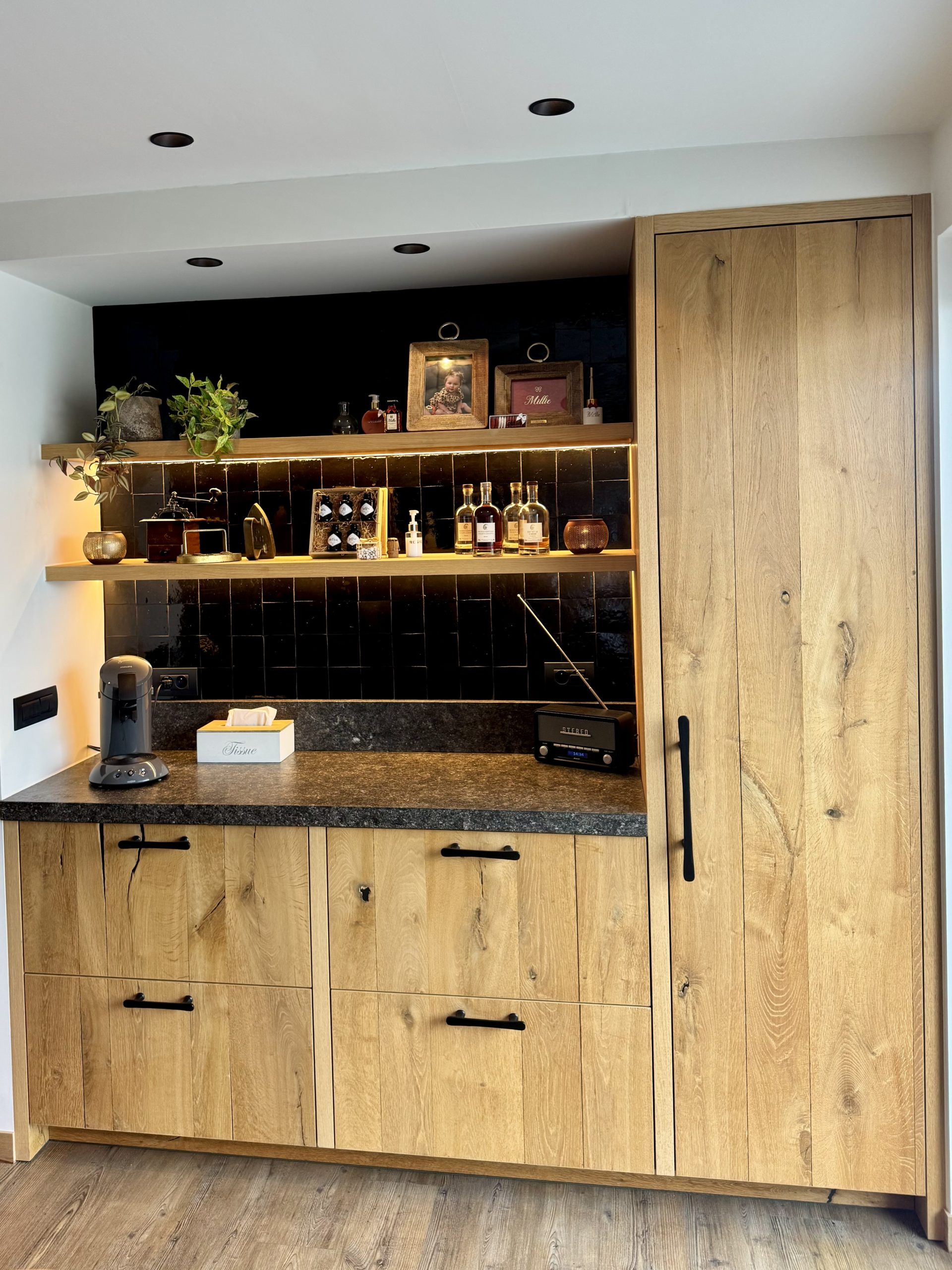 Prachtige landelijke keuken uitgevoerd in eiken natuurfineer. De zachte houttint en het pure lijnenspel brengen warmte en rust in het interieur. Tijdloos design en ambachtelijke afwerking komen hier samen in een harmonieus geheel dat zowel klassevol als uitnodigend aanvoelt.